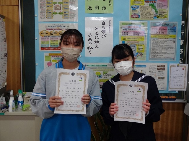 続いて、この秋一番冷え込んだ日の朝に落ち葉ボランティアに参加して、自転車置場の落葉をきれいに掃いて掃除してくれた3年生男女が受賞しました。