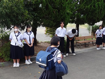 初日は、緊張感と恥ずかしさでなかなか大きな声が出せなかった立候補者もいたようですが、2日目以降は自らの当選のため、登校してきた生徒に向かってさわやかな声掛けをするとともに深々と一礼をして好印象をアピールしていました。