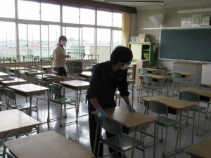 教室の机、いす、トイレ、扉、手すり、スイッチなど、生徒が手を触れる箇所の消毒を次亜塩素酸ナトリウムで消毒しました。