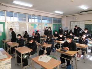 1年生には、1年生が主に4つの小学校から入学してクラスで一緒になってから、7か月が経ち、すっかり学校生活に慣れてきたこと、1年生の素晴らしいところは、それぞれのクラスにしっかりしたリーダーがたくさん生まれ、各クラスが協力して生活することができるようになったことを話しました。授業中の態度や忘れ物をなくす活動やクラスマッチなどの活動で、たくさんのリーダーがクラスをまとめ、協力できるようになりました。あと3ヶ月で、上級生となります。部活動や様々な活動の中で、皆さんらしく、新1年生を温かく迎えることができるように頑張ってください。