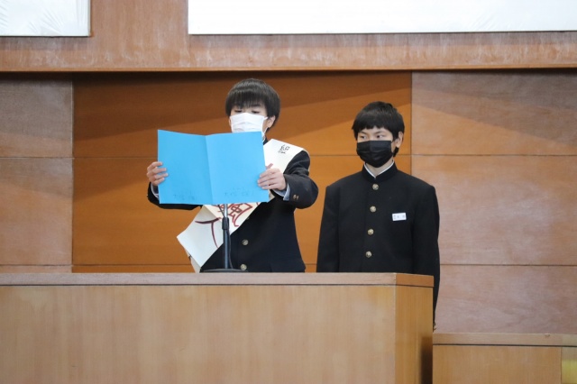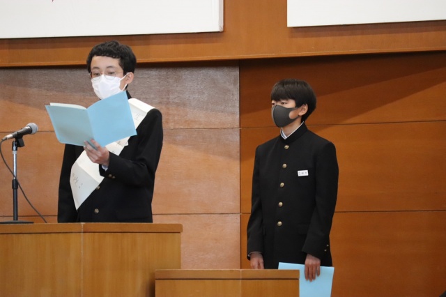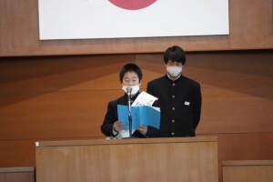 12月3日(金)の6時間目に、生徒会選挙の立候補者の演説会を行いました。1年生は、副会長選挙に8人が立候補しました。2年生は、生徒会長選挙に5人が立候補しました。全校生徒が体育館アリーナに集合し、立派な演説会ができました。