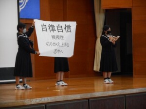 1月14日(水)の業前時間に生徒朝会を実施しました。は、生徒会本部役員より「忍中学校生徒会の新たな活動方針」の説明がありました。生徒会長より『自律自信』という言葉の意味についての説明と、実行の呼びけがありました。忍中生のみなさん、この言葉を胸に様々な活動に積極的に取り組んでくだ ...